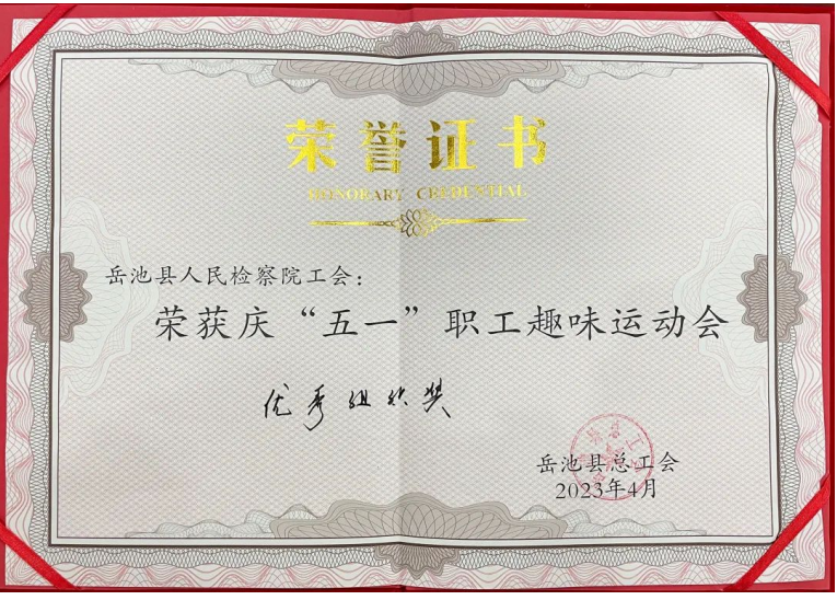4月18日,院工会组织了50人参加岳池县工会庆“五一”职工趣味运动会,队员们发扬“努力拼搏、超越自我、非比寻常,岳检最强”的精神,在54个参赛队中,取得较好成绩,并获得县总工会颁发的优秀组织奖。