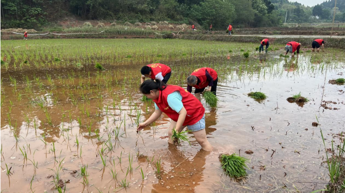(党员志愿者帮助困难群众插秧) 党建引领,吹响春耕“集结号”。坚持党建引领春耕生产,充分发挥基层党组织“战斗堡垒”作用和党员先锋模范作用,镇新时代文明实践所组建春耕生产党员志愿服务队6支,聚焦春耕实际困难,深入田间地头帮助困难群众耕地、播种、施肥,协调水库放水等,确保不误农时。3月以来,100余名党员干部深入田间地头,将党员志愿服务开到春耕一线,累计协助群众种植水稻50余亩,清理主支干渠85公里,河湖清淤12公里,打捞漂浮物100余吨,有效保障了春耕生产。