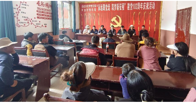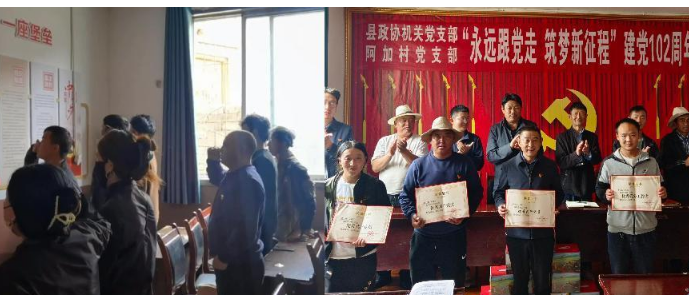为迎接中国共产党成立102周年,激发党组织自觉地将新时期、新常态下的党建工作更好地融入各项工作,进一步增强党组织的向心力、凝聚力和战斗力,调动广大党员的工作积极性和创造性,发挥党员干部的战斗堡垒作用和先锋模范作用。按照中共壤塘县委组织部的安排部署,结合县政协机关和帮扶村实际,连日来,县政协开展“永远跟党走·筑梦新征程”建党102周年系列庆祝活动。
