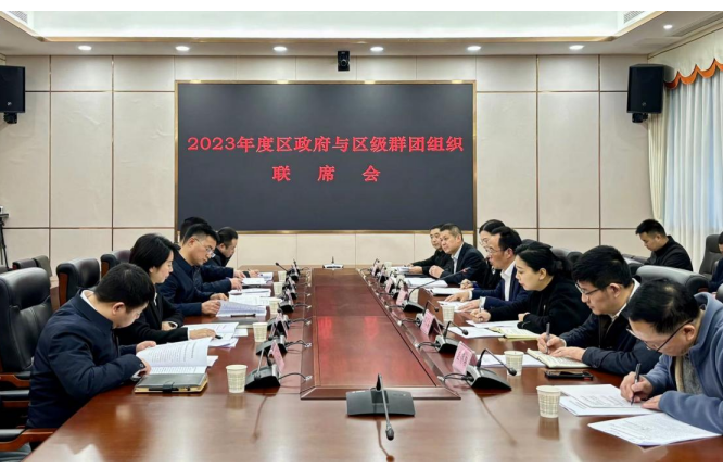 12月29日下午,2023年度区政府与区级群团组织联席会召开,区委副书记、区长覃永利出席会议并讲话,区委常委、区政府副区长郑和主持会议。区委常委、统战部部长、总工会主席陈升涛参加会议。区级相关部门及群团部门负责人参与会议并发言。