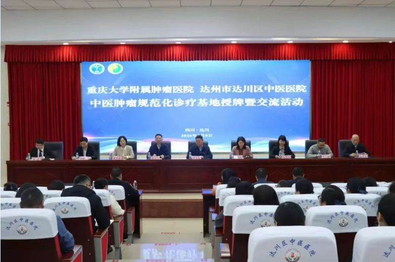 为进一步推动区域中医肿瘤诊疗水平提升,促进优质医疗资源下沉,2026年4月8日,重庆大学附属肿瘤医院与达川区中医医院合作共建的“中医肿瘤规范化诊疗基地”授牌仪式顺利举行。仪式的成功举办,标志着双方在中医药防治肿瘤领域的深度合作正式启航,将为达川区肿瘤患者提供更加规范、系统、优质的中西医结合诊疗服务。 仪式现场,区卫生健康局党委书记、局长向晓燕致欢迎辞。她首先对重庆大学附属肿瘤医院各位领导专家的到来表示热烈欢迎,并对基地的成立表示热烈祝贺。她指出肿瘤防治事关民生,中医药在肿瘤诊疗中优势显著,希望双方以基地为契机,深化协作,让优质医疗资源惠及达川群众。 重庆大学附属肿瘤医院党委书记吴永忠在讲话中阐述了建设中医肿瘤规范化诊疗基地的重要意义,并分享了医院肿瘤诊疗与科研经验,表示将通过技术输出、人才培训、质量控制、远程协作等多种方式,全力支持基地的建设与发展,共同探索中西医结合防治肿瘤的创新模式,携手提升区域肿瘤综合防治水平,更好地满足人民群众多层次、多样化的健康需求。 在与会领导、嘉宾和医务人员代表的共同见证下,双方进行了庄重而简朴的授牌仪式。吴永忠书记将“重庆大学附属肿瘤医院中医肿瘤规范化诊疗基地”的牌匾授予达川区中医医院党委副书记、院长潘华良,现场响起热烈掌声,标志着双方在中医肿瘤领域深度合作正式启动。 此次授牌仪式的圆满举行,是推动优质医疗资源下沉、规范基层中医肿瘤诊疗的重要实践。未来,双方将携手共进,不断深化合作内涵,共同推动中医肿瘤诊疗的规范化、标准化建设,为守护群众健康,助力中医药事业传承创新发展贡献力量。 仪式后,与会人员参观了医院相关特色科室,并就后续合作事宜进行交流。
