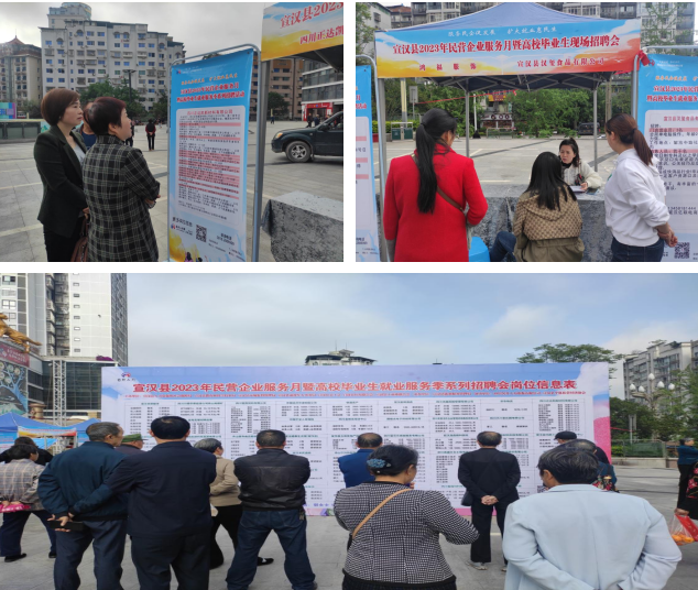 就业是民生之本、和谐之基。为深入贯彻党的二十大精神,落实党中央、国务院稳增长稳就业稳物价决策部署和“两个毫不动 摇”方针,促进民营经济高质量发展,带动和扩大就业,5月24日,宣汉县总工会联合宣汉县人力资源和社会保障局、宣汉县就业局等单位,在县城巴人广场举办了宣汉县2023年民营企业服务月暨高校毕业生就业服务季活动。本次服务活动的主题是“服务民企促发展,扩大就业惠民生”,指在宣传相关就业政策,搭建就业平台,帮助更多的人实现就业。