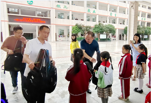 慰问组一行为100名留守儿童送上了包含书包、体育用品等慰问礼包。