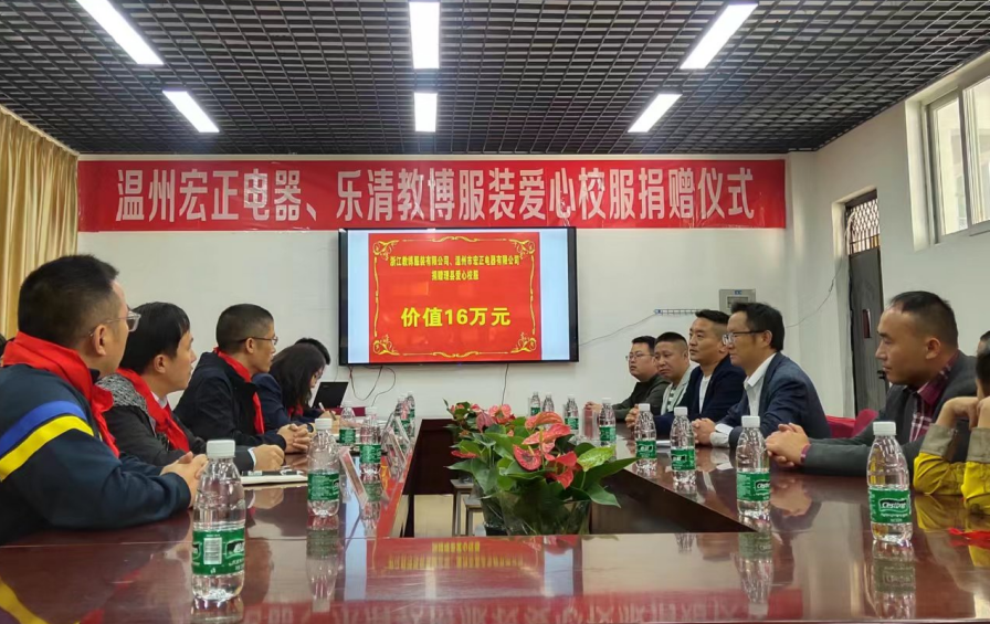 仪式上,浙江温州宏正电器、浙江乐清教博服装两家爱心企业向米亚罗小学、上孟小学、下孟小学、通化小学的学生捐赠了总价值16万元的校服。