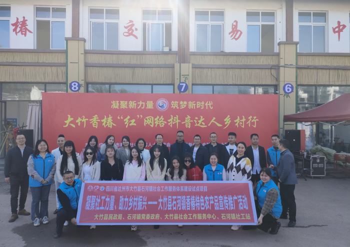 凝聚社工力量、助力乡村振兴。为促进大竹县香椿产业发展,宣传推广香椿特色农产品。由大竹县社会工作服务中心联合达州市新联会、大竹县新联会、大竹县香椿产业协会、石河镇社工站共同举办的大竹香椿红“抖音达人乡村行”活动,3月14日在石河镇香椿交易市场举行。本次活动共邀请了20余名抖音达人、自媒体大V走进大竹县石河镇香椿交易市场及栽种基地,通过在线直播等网络方式进行香椿产品宣传,以网络公益推动大竹特色农产品走向全国。
