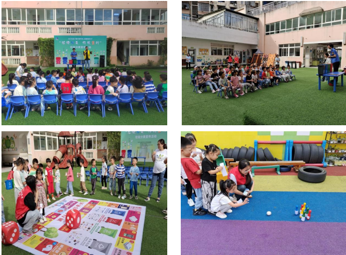活动开始前,青年志愿者组织到场的小朋友有序签到。活动开始后首先由公平街道生态环境办马老师开展垃圾分类知识宣讲,马老师生动形象地讲解了“垃圾四分类”等知识,普及垃圾分类的重要性,随后就垃圾类型、垃圾分类的优点等方面进行了提问,小朋友们踊跃发言,现场氛围活跃。紧接着垃圾分类游园活动开始,此次游园会活动共有垃圾分类飞行棋、垃圾分类保龄球、垃圾分类大转盘、垃圾分类掷沙包、垃圾分类套圈5个环节。现场的小朋友热情高涨,纷纷参与到趣味游园活动中。通过趣味游戏的方式,让小朋友在游戏中边玩边学,学会了很多有用的垃圾分类知识。