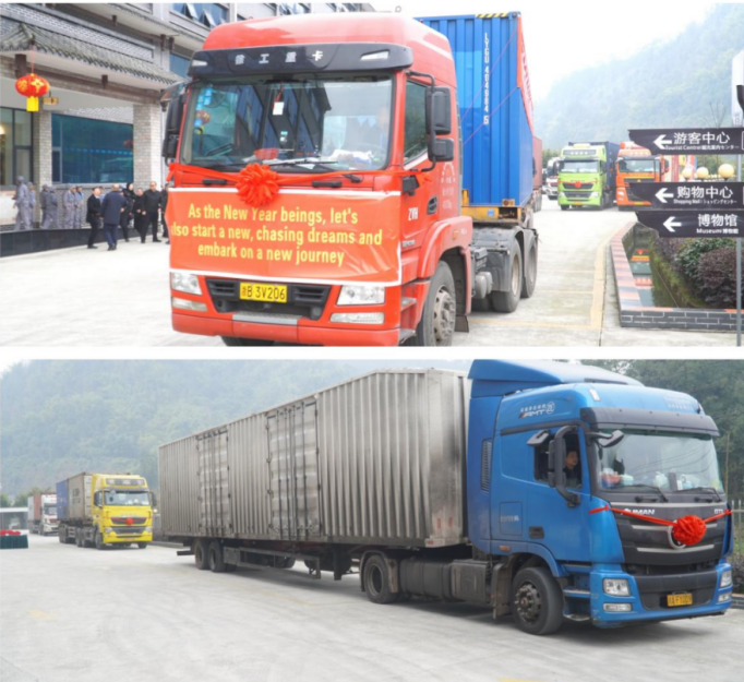 伴随热烈而响亮的汽笛,载满森态源魔芋产品的20辆货车缓缓驶出工厂,带着希望与梦想,踏上征程。