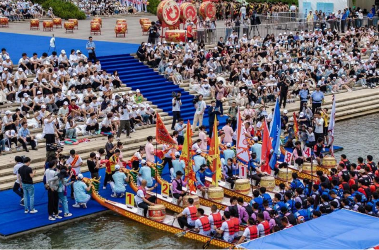 随着雄壮的鼓点声响起,比赛正式拉开帷幕。各支队伍精神饱满,队员们身着统一服装,在激昂的鼓声中挥臂划桨,齐心发力。他们的动作整齐划一,强劲有力,随着节奏的加快,龙舟如“离弦之箭”般疾驰向前,河面上水花四溅,形成了一幅壮观的画面。