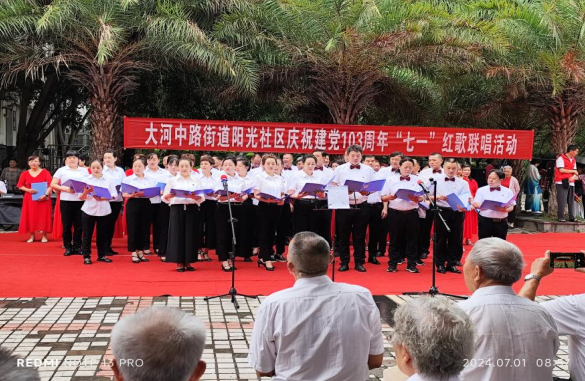 为庆祝中国共产党成立103周年, 7月1日上午9点,攀枝花市仁和区大河中路街道阳光社区党委组织辖区100余名党员在阳光家园广场开展了“庆七一红歌联唱”活动。