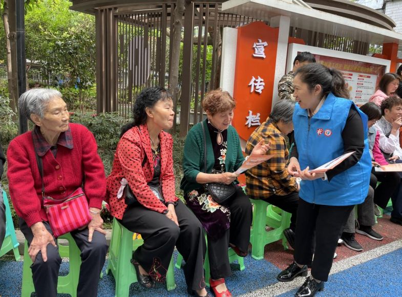 (社工向社区居民发放老年人权益保护等相关宣传资料)