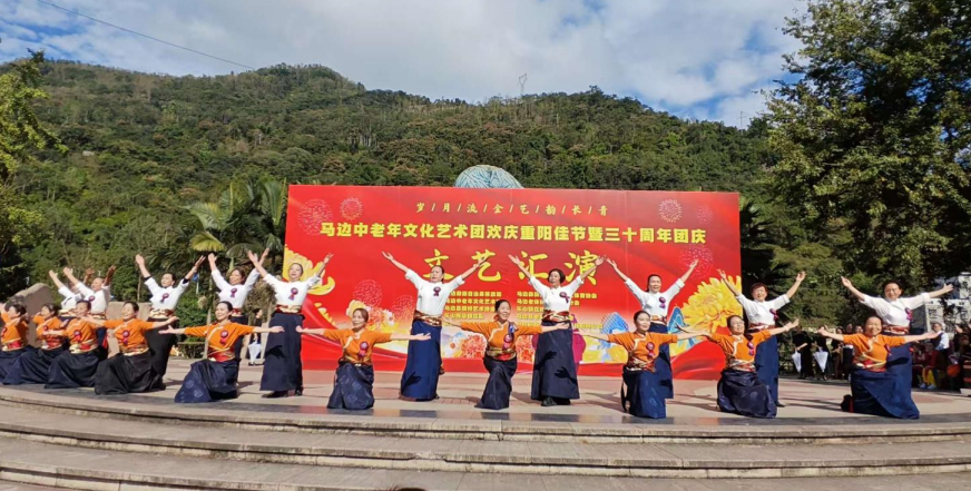 10月30日上午,马边彝族自治县张坝社区熊猫广场座无虚席,热闹非凡,现场洋溢着一片喜庆、欢乐、祥和的浓厚氛围。以“岁月流金·艺韵长青”为主题的马边中老年文化艺术团欢度重阳佳节暨成立30周年团庆文艺汇演活动在此隆重举行。