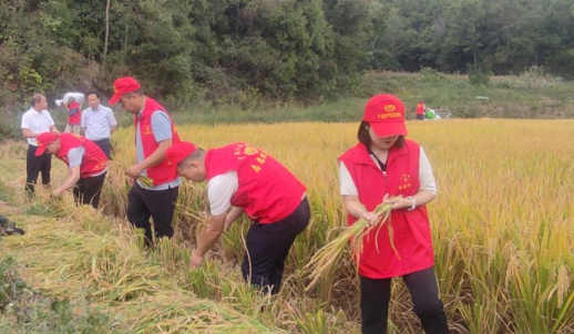 顶着炎炎烈日,身着“红马甲”的党员干部深入田间地头,割稻、拾稻、运稻、装袋……大家干得热火朝天,汗流浃背,一抹抹“志愿红”和金灿灿的稻田交相辉映,勾勒出一幅幅和谐美好的秋收助农图景。