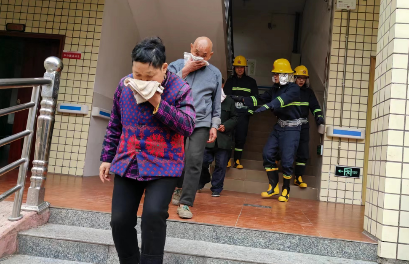 演练中,按照模拟预案设定的地点,工作人员发现着火后第一时间启动灭火应急处置预案,开展灭火处置工作,并按照规定的撤离路线,搀扶好老人用湿毛巾捂住老人的口鼻,避免吸入浓烟,迅速有序疏散到了安全地带。
